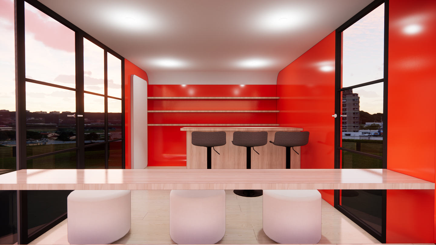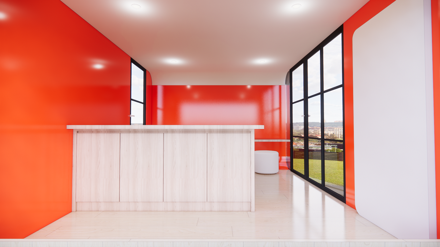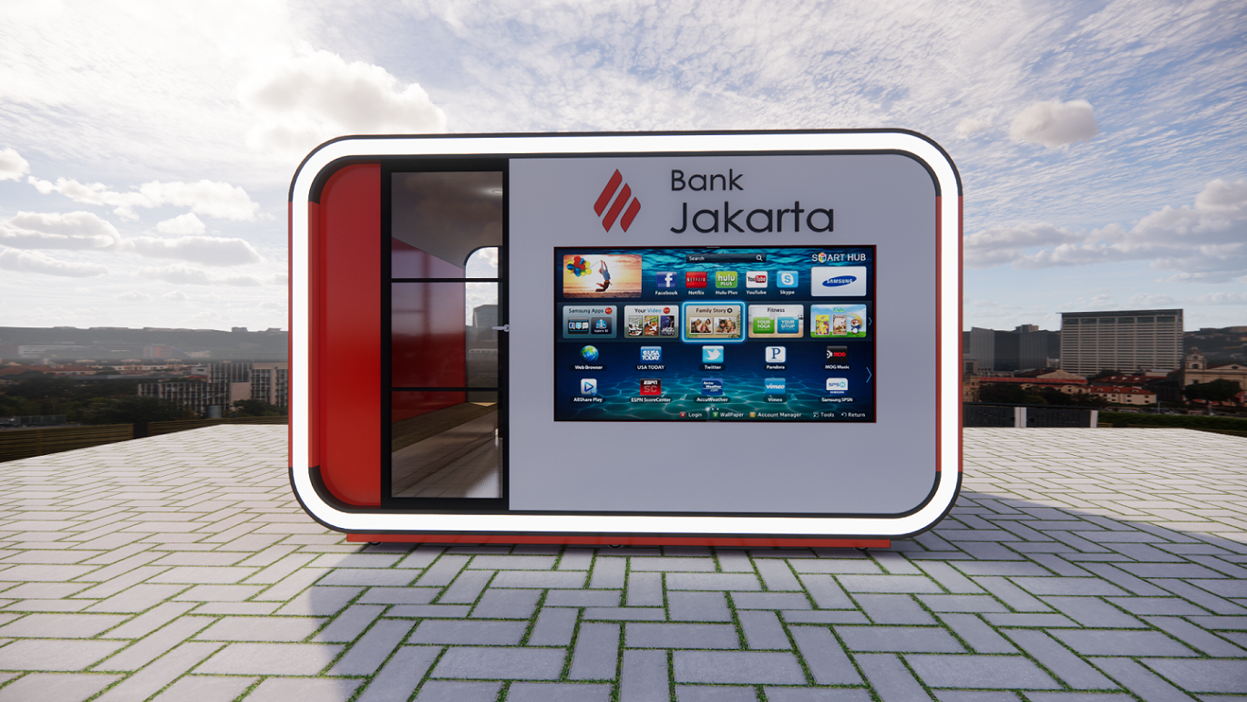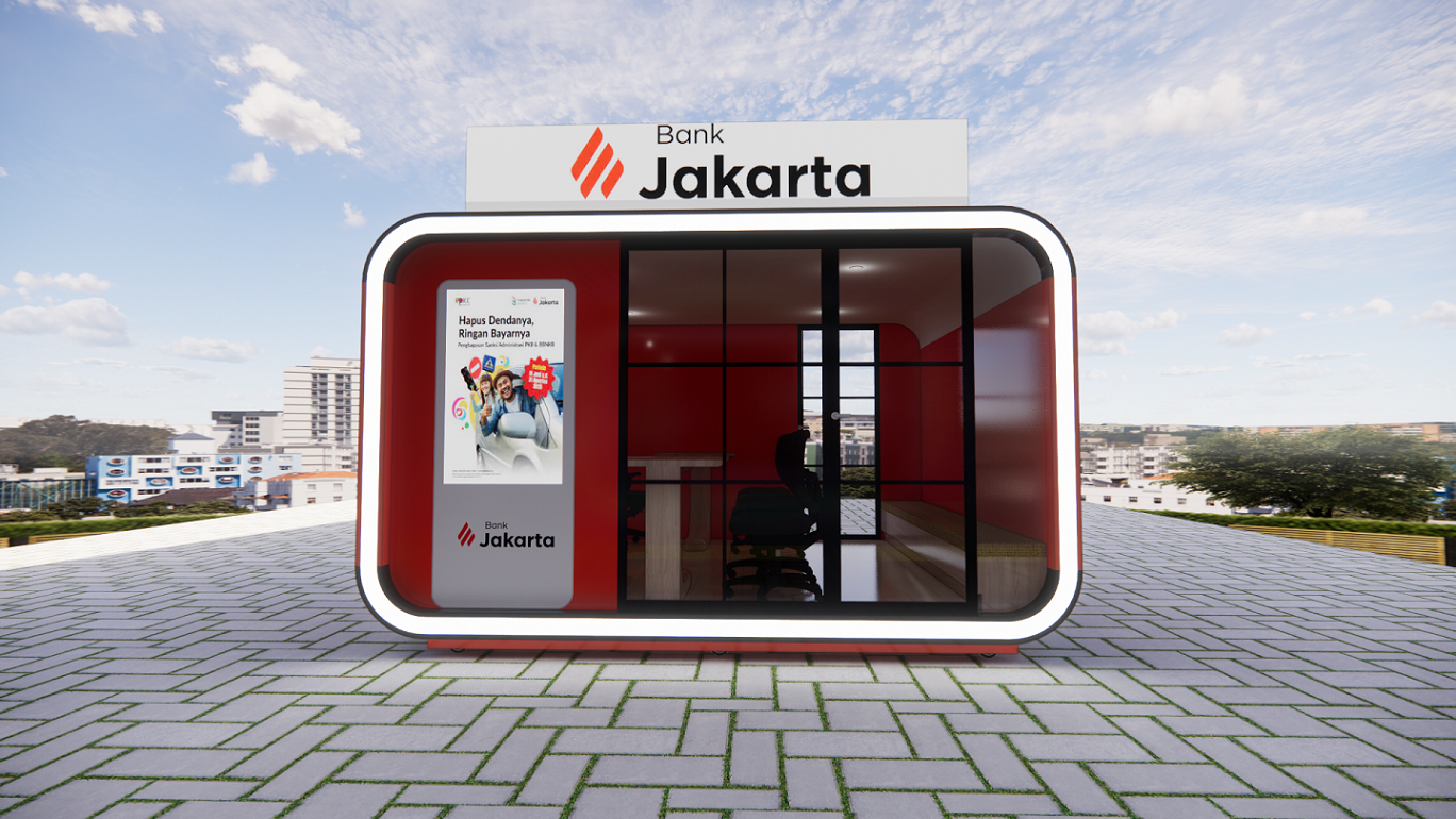 Desain booth modern Bank Jakarta dengan konsep modular dan futuristik. Mengusung nuansa merah khas identitas brand, booth ini dirancang fungsional sekaligus estetik dengan ruang meeting compact, area layanan interaktif, serta fasad digital yang mendukung kebutuhan perbankan masa kini.